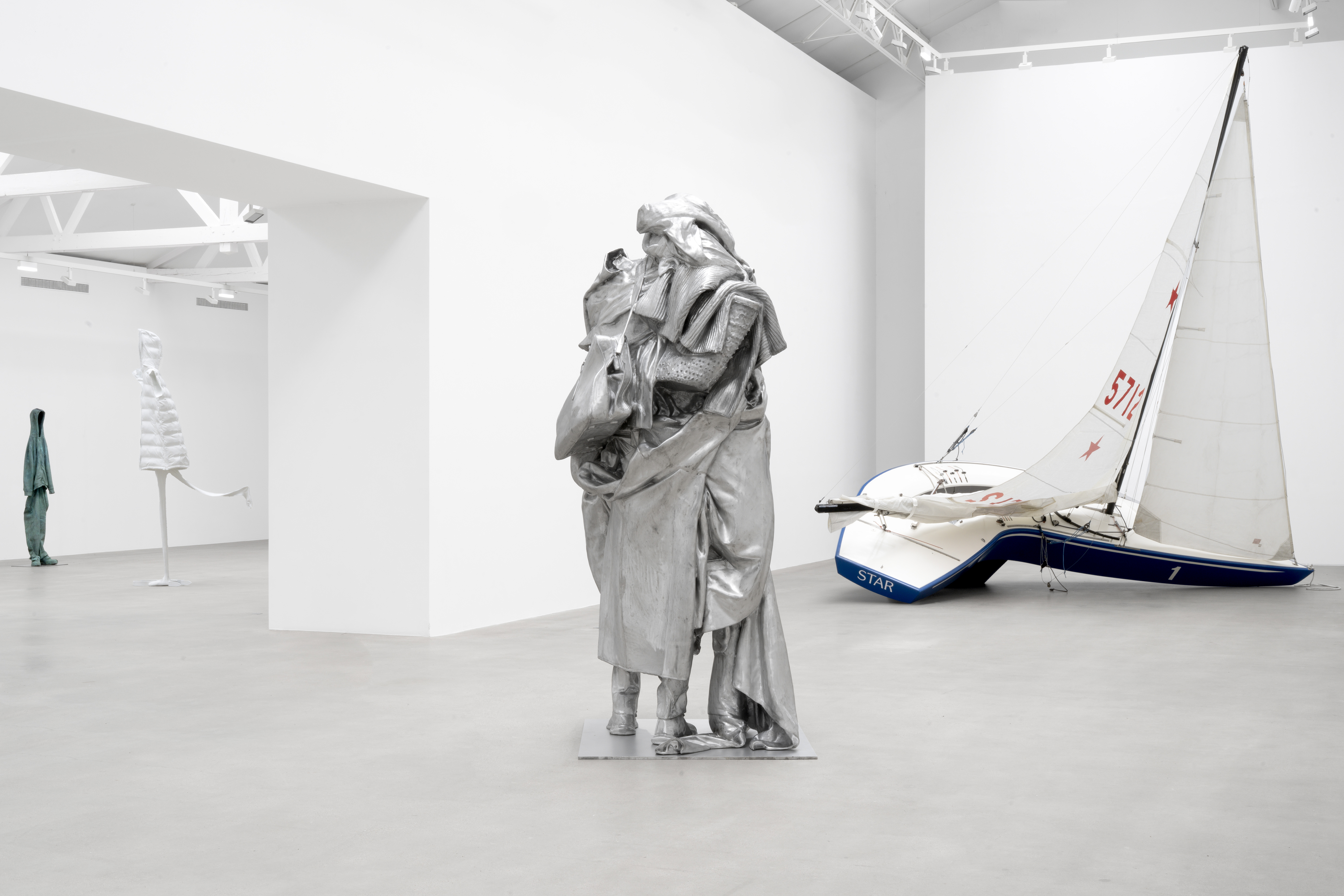 L’exposition s’articule autour de deux installations monumentales : School, dont la salle de classe exiguë est tapissée de cartes et documents à la gloire de l’empire colonial français (la vérité d’une époque étant devenue scandaleuse) et Star, un voilier de plaisance à la coque courbée, pour faire des ronds dans l’eau plutôt que partir à la découverte. Les séries de sculptures les plus célèbres de l’artiste sont aussi là, des Box People (formes cubiques habillées dépourvues de têtes) aux Mind Bubbles (formes ovoïdes perchées sur des jambes longilignes), et aux Substitutes (vêtements rigidifiés apparaissant comme des moules vides) ou encore aux One Minute Sculptures, proposant aux visiteurs de devenir des sculptures vivantes éphémères en enfilant des pulls géants.