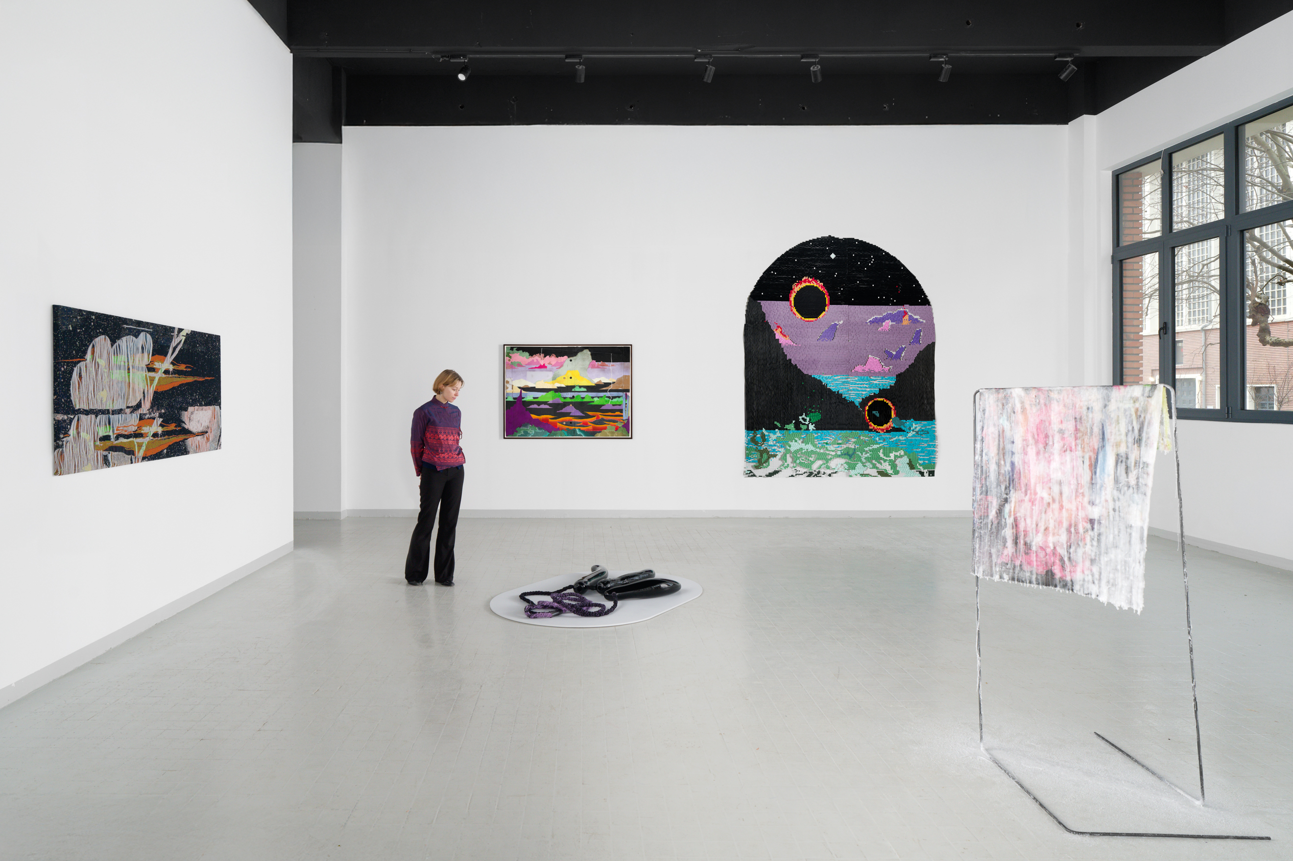 L’exposition occupe trois niveaux de la galerie qui investit aussi pour l’occasion un espace éphémère. Otobong Nkanga y présente plusieurs tapisseries (l’une, monumentale, provient de son solo au MoMA, les autres sont de formats plus domestiques), des sculptures reliant des formes en bois, en pierre et en verre soufflé, ainsi qu’une nouvelle série de dessins épurés sur tablettes d’argile, dont certains forment des diptyques avec des poèmes gravés. Ses œuvres dialoguent tour à tour avec les dessins au pastel gras et sec de Kicsy Abreu Stable, les grands paysages colorés sur carton de Beau Disundi, la vidéo et les sculptures d’Angyvir Padilla. Remarquablement orchestré, l’ensemble témoigne d’une réflexion sur la circulation des biens, le déracinement, la mémoire.