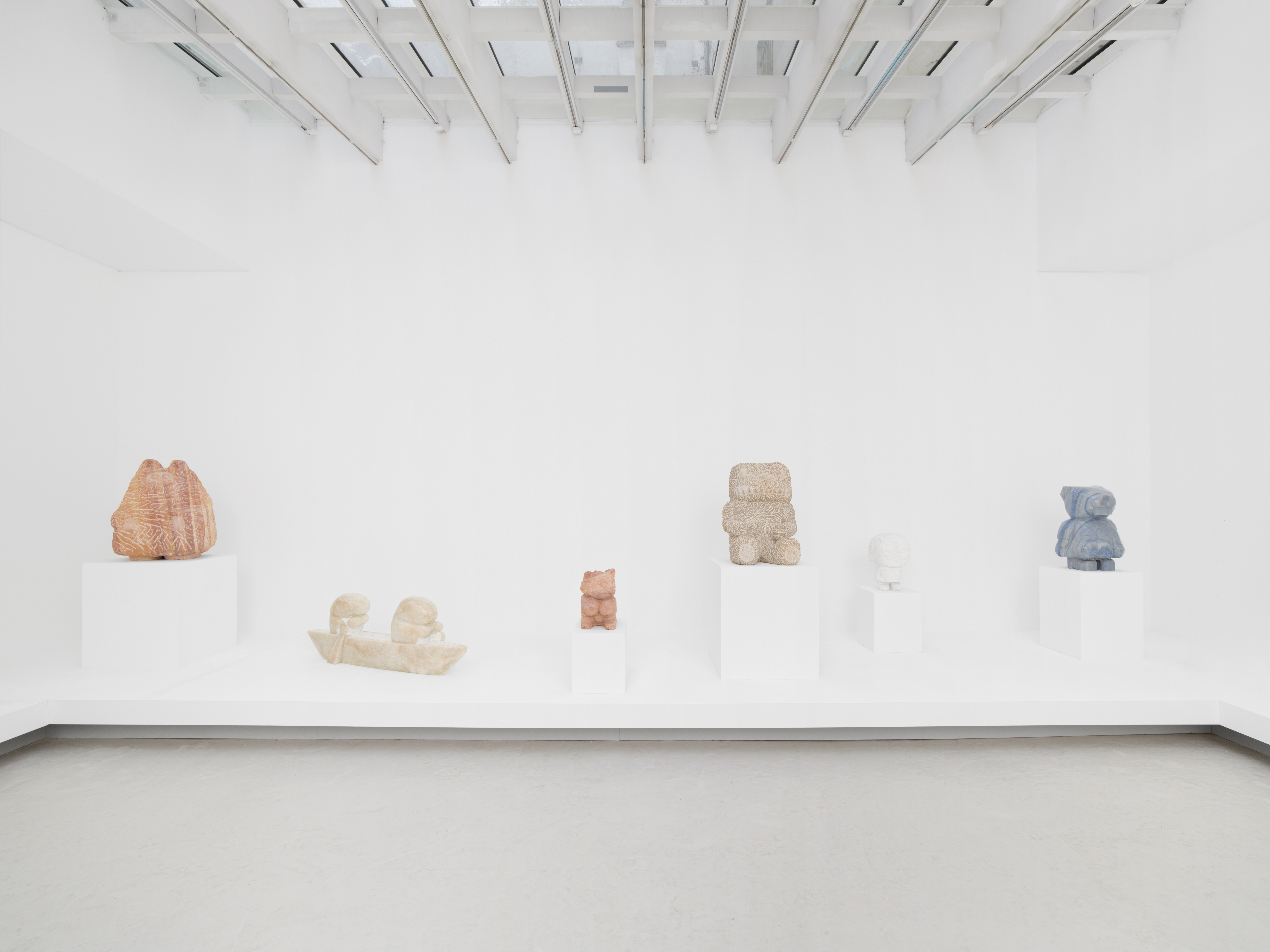 Un bestiaire moitié pop moitié gothique de créatures aux traits finement ciselés dans la masse – Stefan Rinck pratique la taille directe. Et il s’amuse : en témoignent la richesse des référents culturels liés au répertoire historique de la sculpture (figures gardiennes et divinités zoomorphes), la maîtrise de différentes échelles, monumentales ou domestiques, la variété de matières (marbre rose, onyx, grès, calcaire…). Plus encore que la fantaisie des formes (ours grimaçant, demoiselle à tête de château, Labubu géant, alligator…), c’est le désœuvrement de ces figures fantastiques qui impose leur présence.