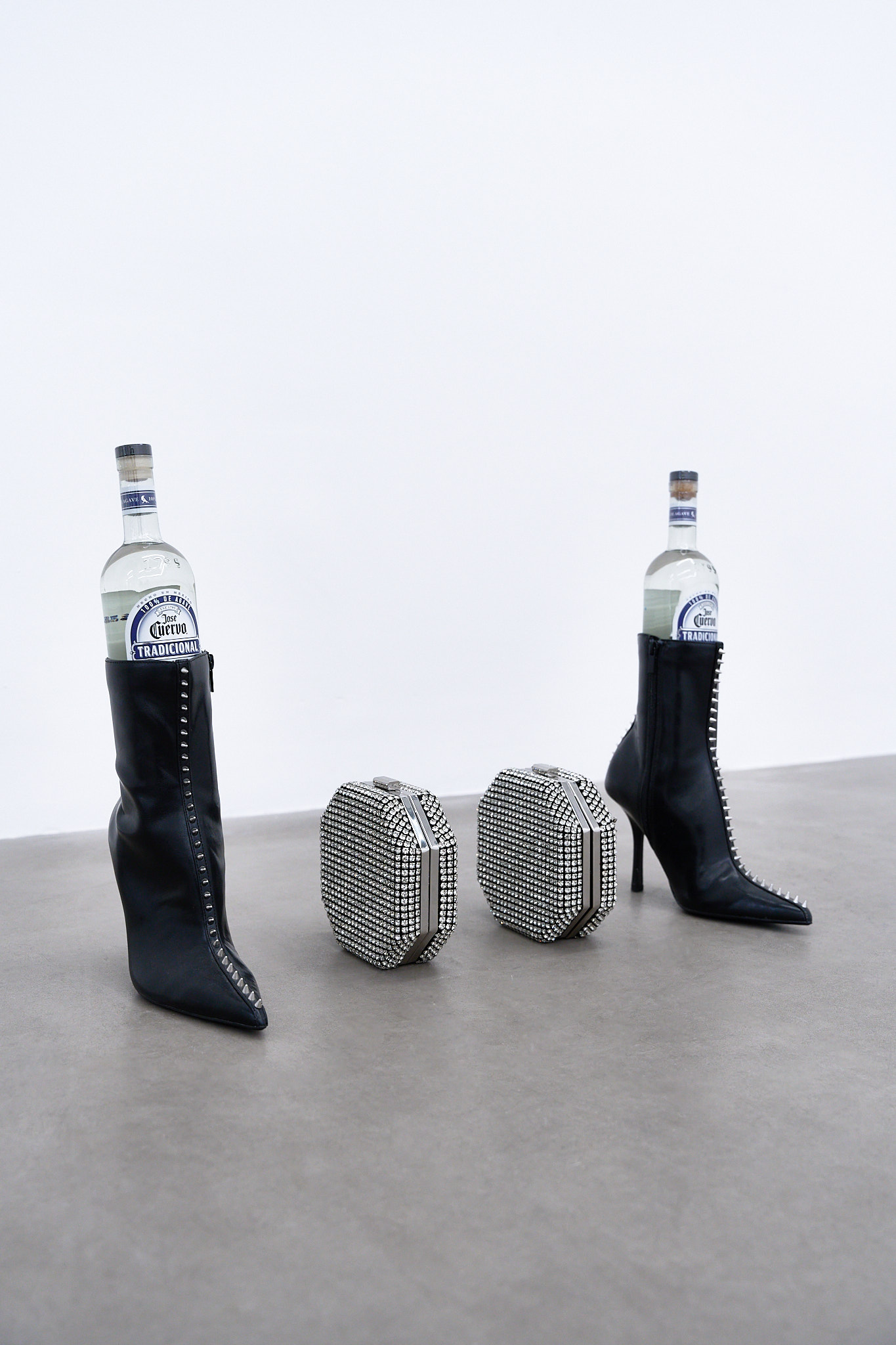Sa scénographie théâtrale, évoquant un shooting de mode conceptuel flirtant avec l’exhibitionnisme queer, place le « white cube » sous vide.