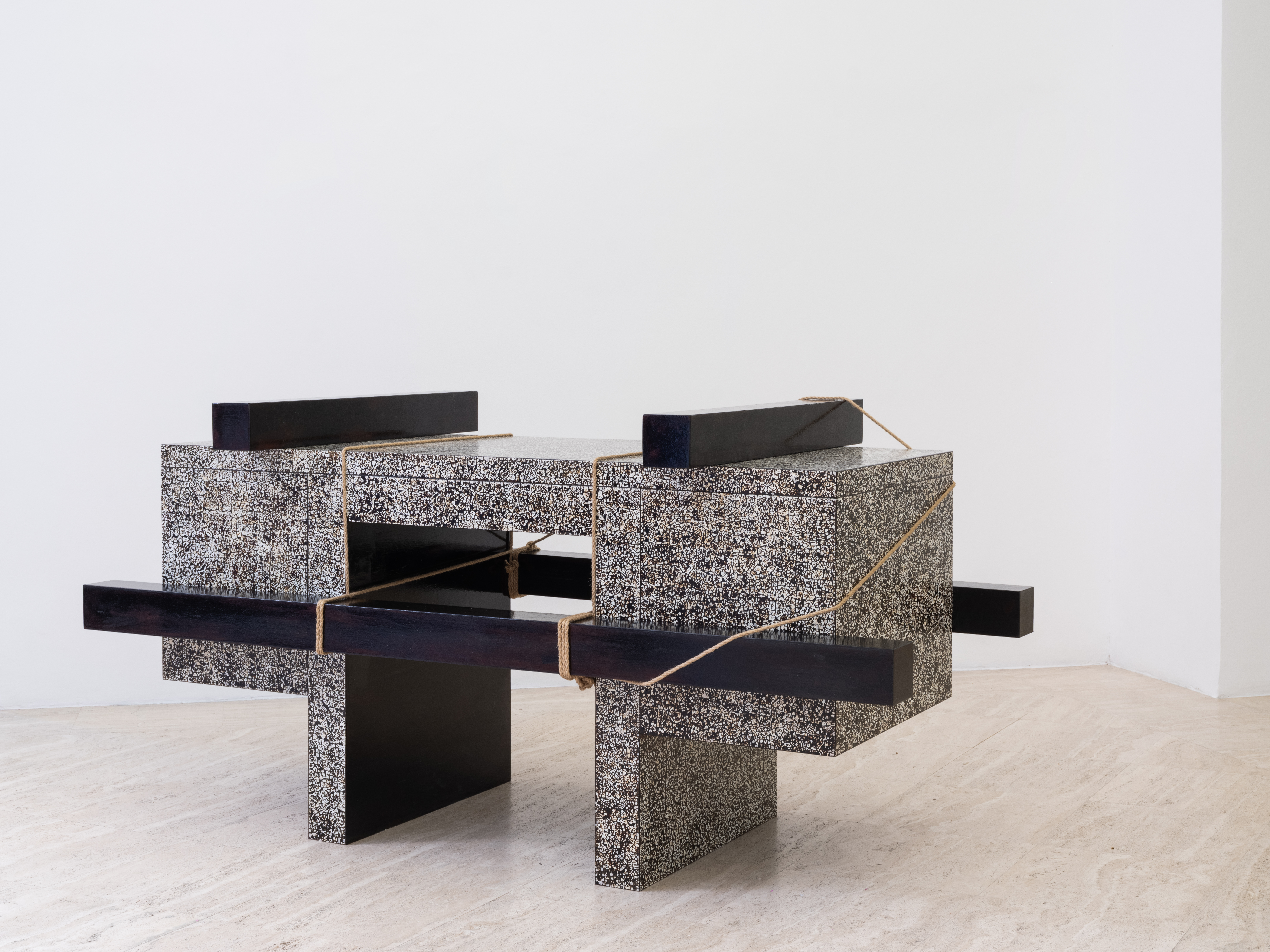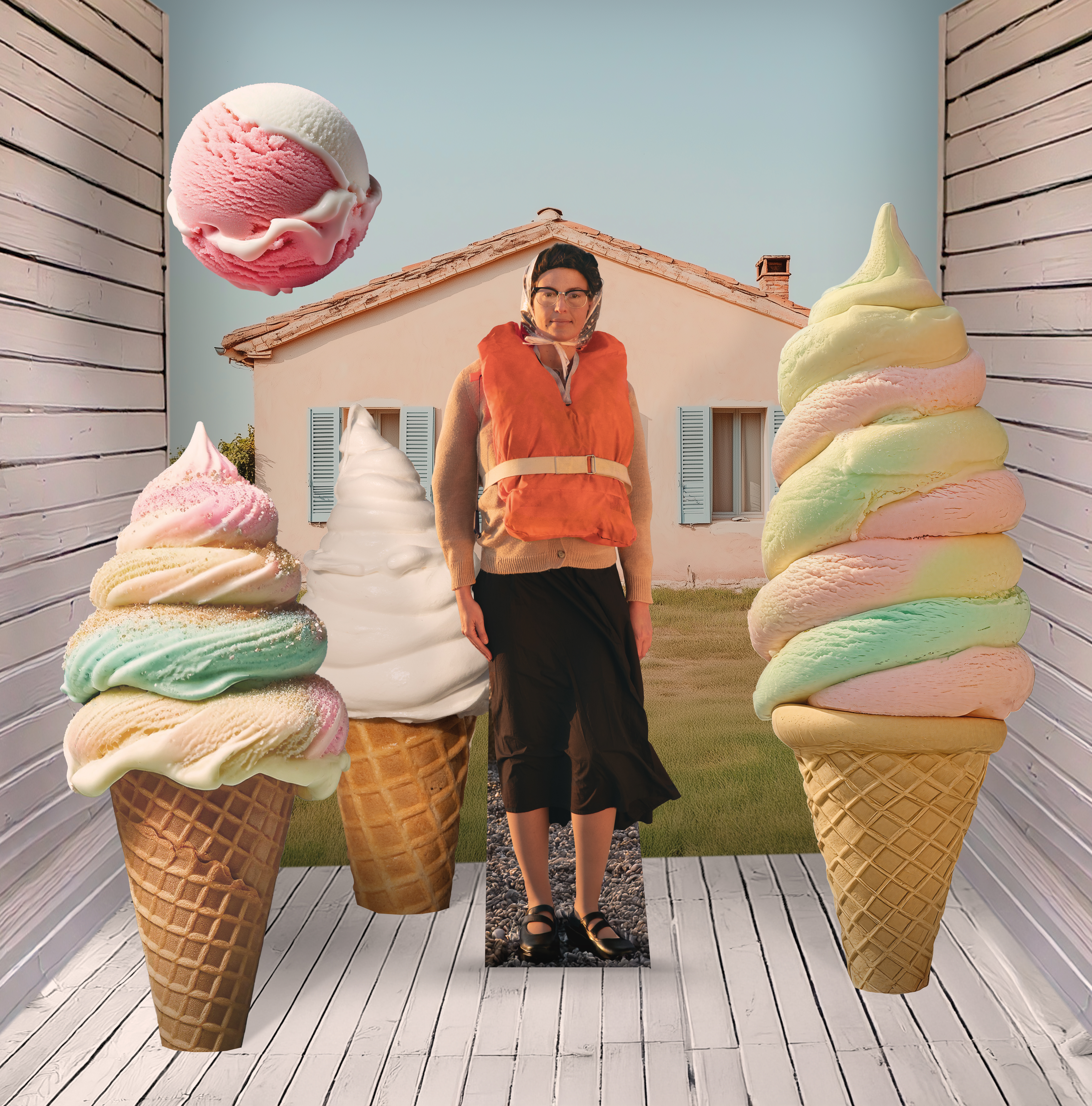 ↘ Entre architectures singulières, langage visuel hybride et motifs absurdes, l’artiste britannique met en scène une réflexion sensible sur l’identité, les corps et la culture dominante.