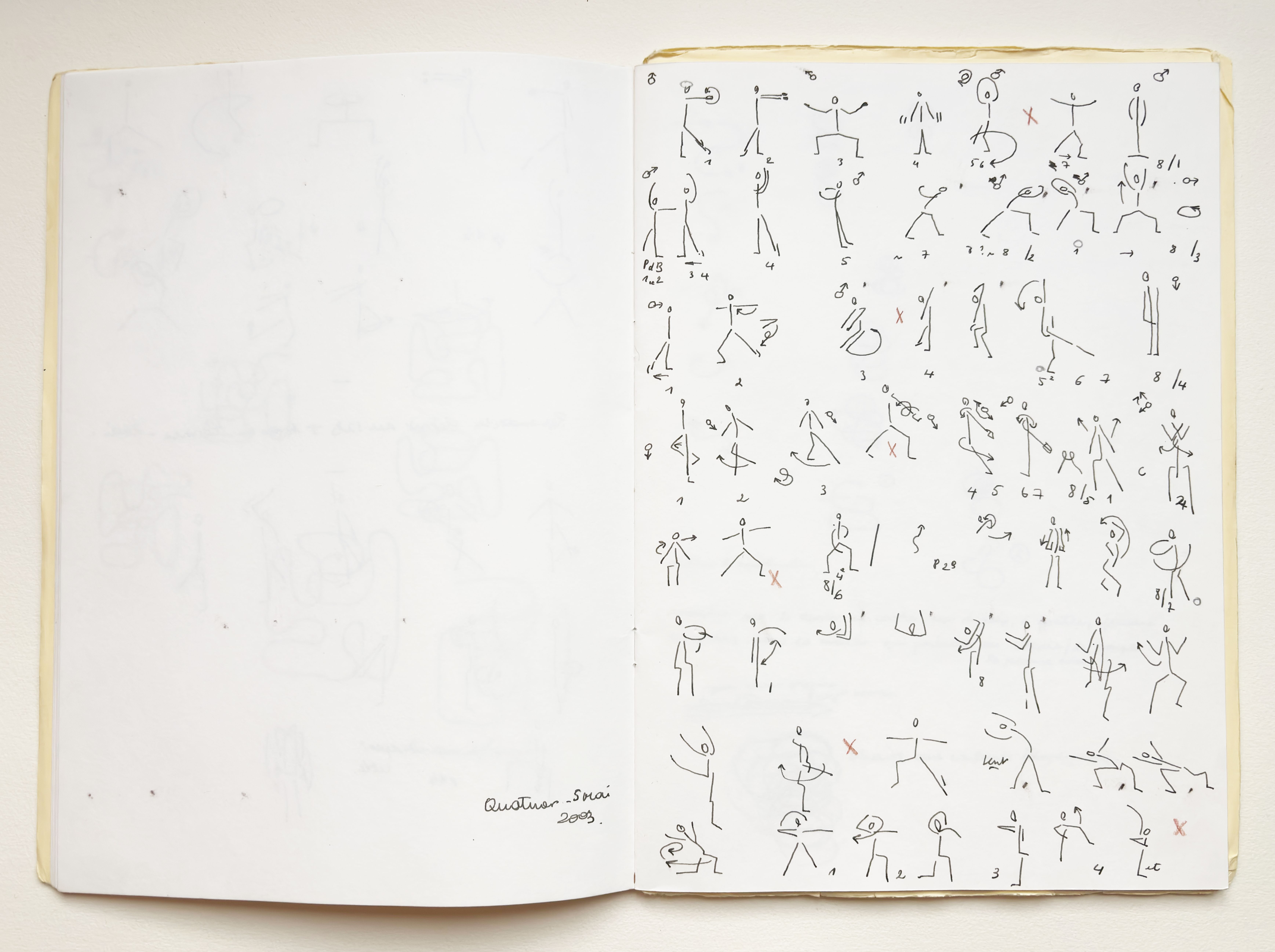 À travers le corpus d’écrits et de dessins de l’exposition, nous rencontrons des « dessins de pensée », c’est-à-dire des manifestations graphiques d’idées, expression d’un mouvement de la pensée en acte. Tels des récits précurseurs du geste à venir, ils constituent déjà la preuve d’une mise en mouvement physique, du cerveau et de la main, dans une pré-danse non spectaculaire. La chorégraphe Mary Wigman, figure majeure de l’Ausdrucktanz allemande (ou danse d’expression) qui ouvrira la voie à la modernité en danse, affirmait vouloir atteindre, par des moyens corporels, ce que la pensée a de plus impalpable. L’enjeu est de taille : car les traces graphiques de la danse ne constituent jamais pleinement les traces du geste lui-même, sauf lorsqu’elles sont empreintes directes du corps. Elles représentent avant tout la captation d’un processus intellectuel et somatique, qui trouve sur la page d’un carnet ou d’un livre un ancrage rendant partiellement visible ce qui autrement resterait invisible.