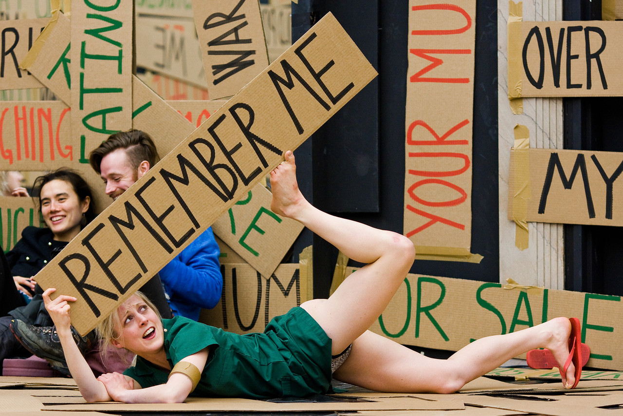 Dans cette performance iconique, La Ribot met en scène trois danseuses prises dans un flux continu de rires et de chutes. Entre accumulation visuelle et geste politique, près de mille panneaux de carton recouverts de mots envahissent progressivement l’espace.