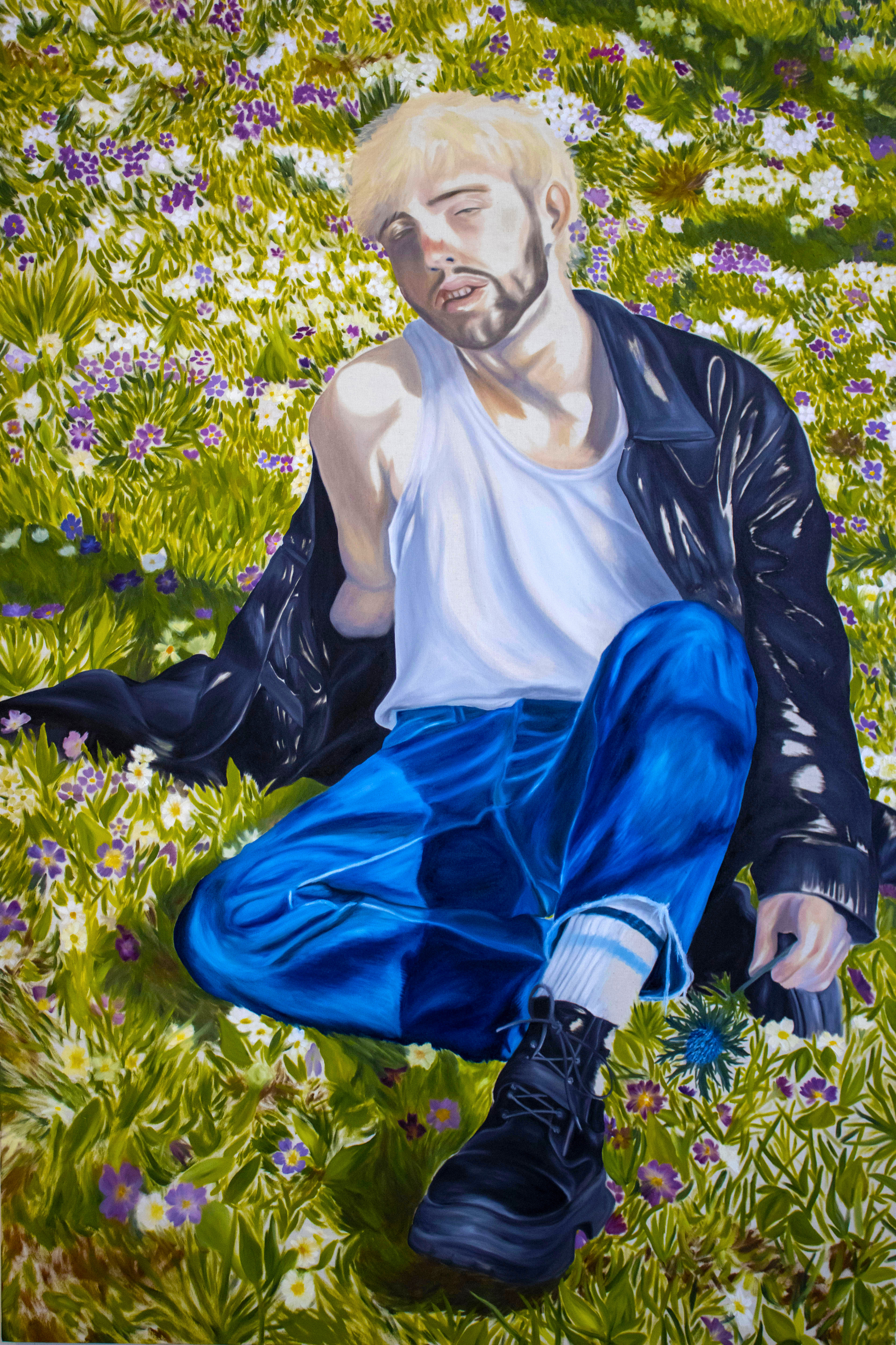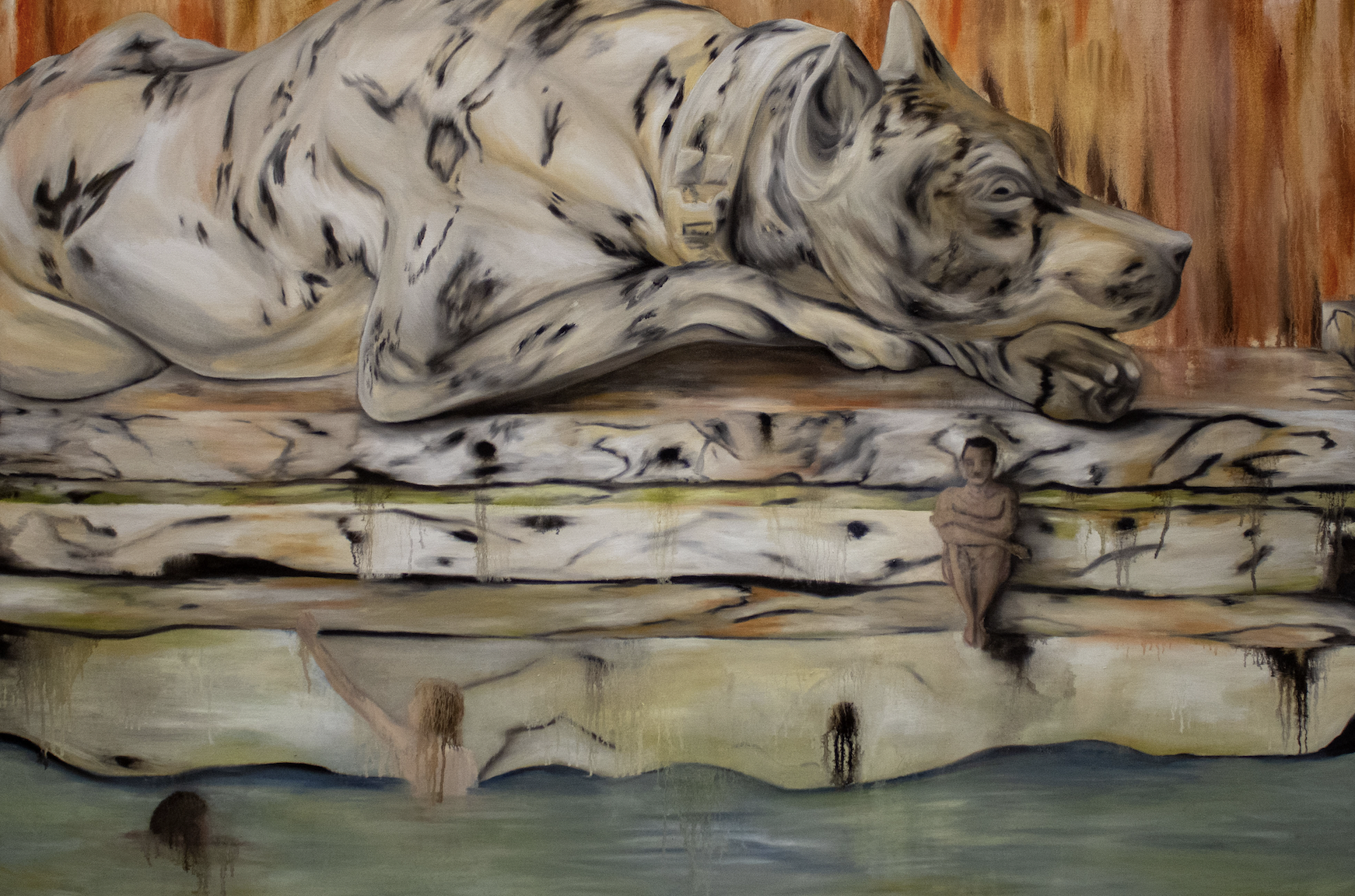 Pour dire le trouble profond, Baptiste fait le choix politique de l’utopie, et dépeint la réalité comme un mythe. Il brouille le réel et la fiction, l’expérience et le fantasme. Dans ses peintures comme dans ses récits, la communauté s’arrache du monde et s’enrobe partout d’une lumière trop forte qui fait briller les hommes-chiens. Baptiste écrit une histoire des impossibles advenus.